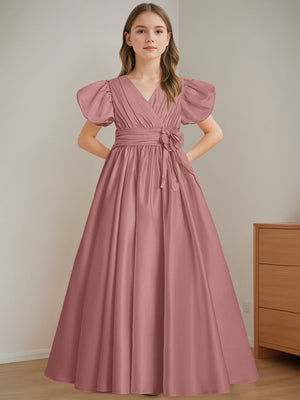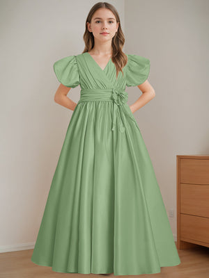 A-Line/Princess V-Neck Short Sleeves Floor-Length Flower Girl Dress with 3D Flowers