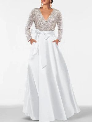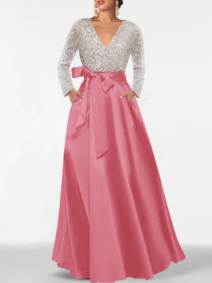 A-Line/Princess V-Neck Long Sleeves Floor-Length Mother of the Bride Dresses With Pocket & Sequins