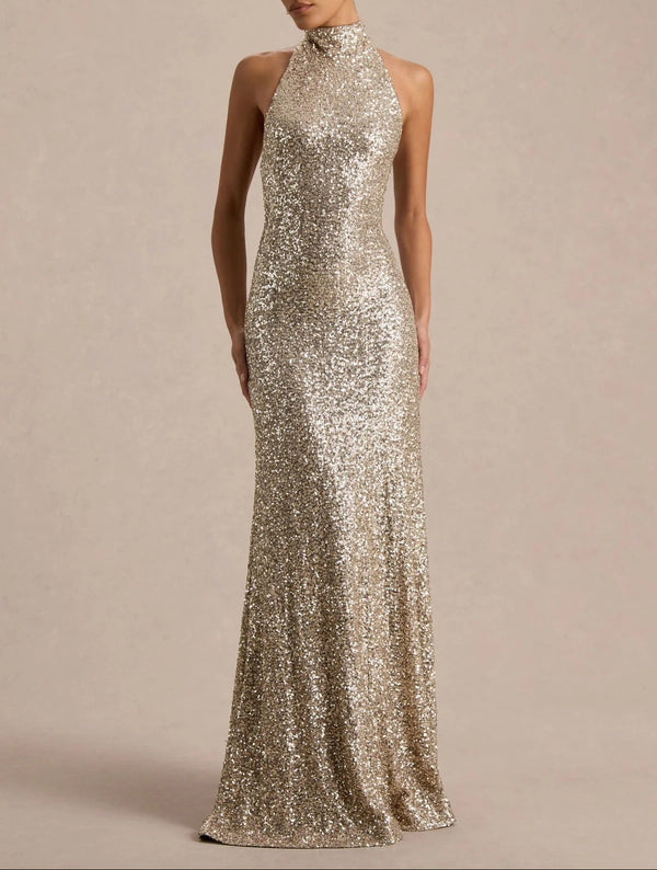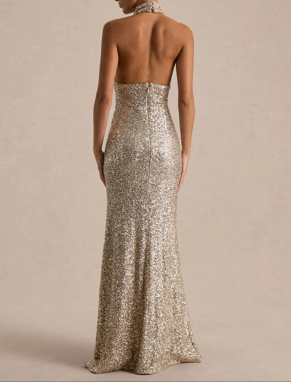 #N359110 Mermaid Sequins Eveing Dress Formal Halter Neck Sleeveless Floor Length Sparkle Christmas Party