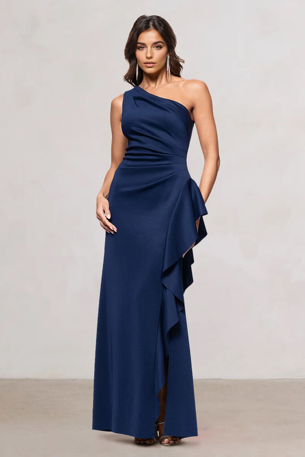 #N353510 Sheath/Column Satin One-Shoulder Sleeveless Floor-Length Evening/Wedding Guest Dresses With Side Slit & Ruffle
