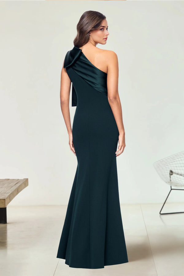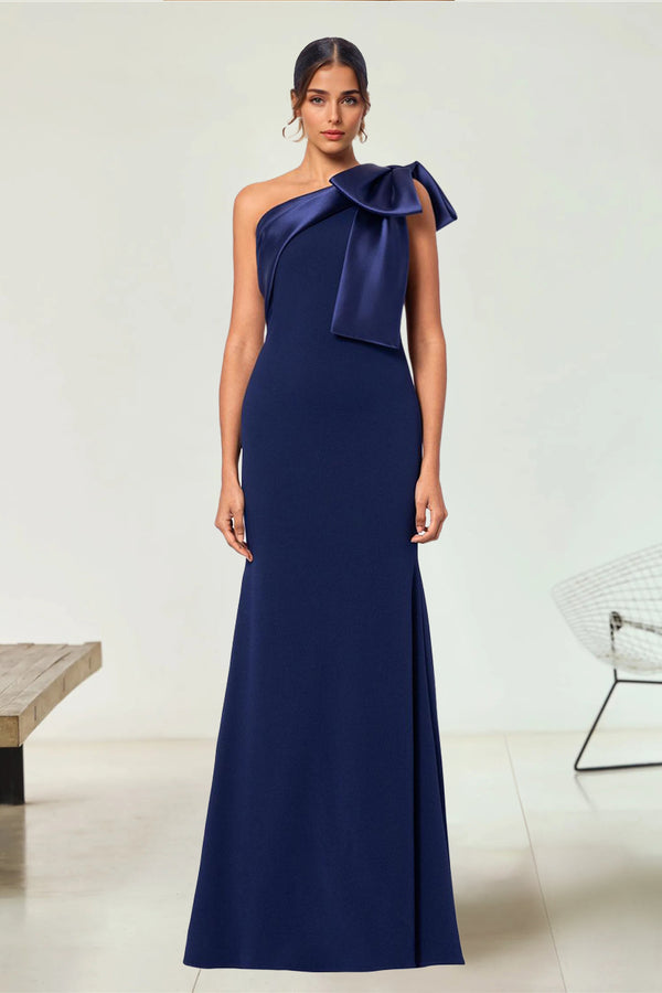 #N353010 Sheath/Column Stretch Crepe & Satin Bow One-Shoulder Sleeveless Floor-Length Evening/Wedding Guest Dresses