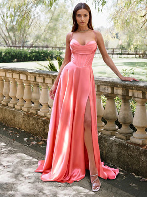 Women's Sheath/Column Silk like Satin Spaghetti Straps Floor-Length Long Prom Dresses