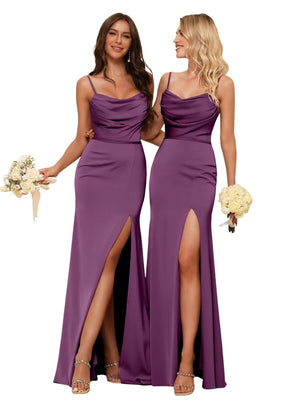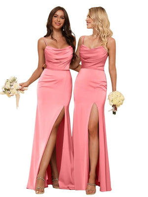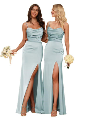 Sheath/Column Spaghetti Straps Sleeveless Floor Length Bridesmaid Dresses Satin with Ruffles Split