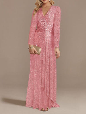 Mermaid/Trumpet V-Neck Long Sleeves Floor-Length Party Cocktail Dress with Sequins