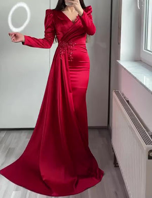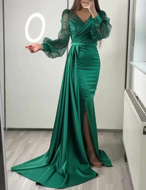 Mermaid Sequin Evening Gown Ruched Satin Dress Long Sleeves Floor Length V Neck with Sequins Overskirt Prom