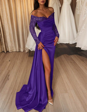 Sheath/Column Off-the-Shoulder Floor-length Long Prom Dresses With Split Side & Sequins