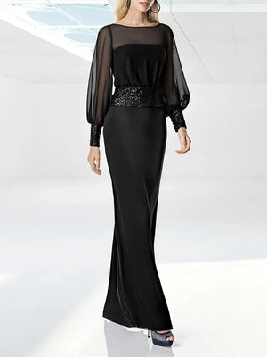 Sheath/Column Mother Of The Bride Dresses Round Neck Long Sleeves Floor length Formal Evening Dresses With Sequins Belt