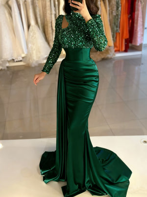 Mermaid Evening Gown Sequin Elegant Dress Formal Sweep / Brush Train Long Sleeve High Neck Satin with Pearls Masquerade Dress