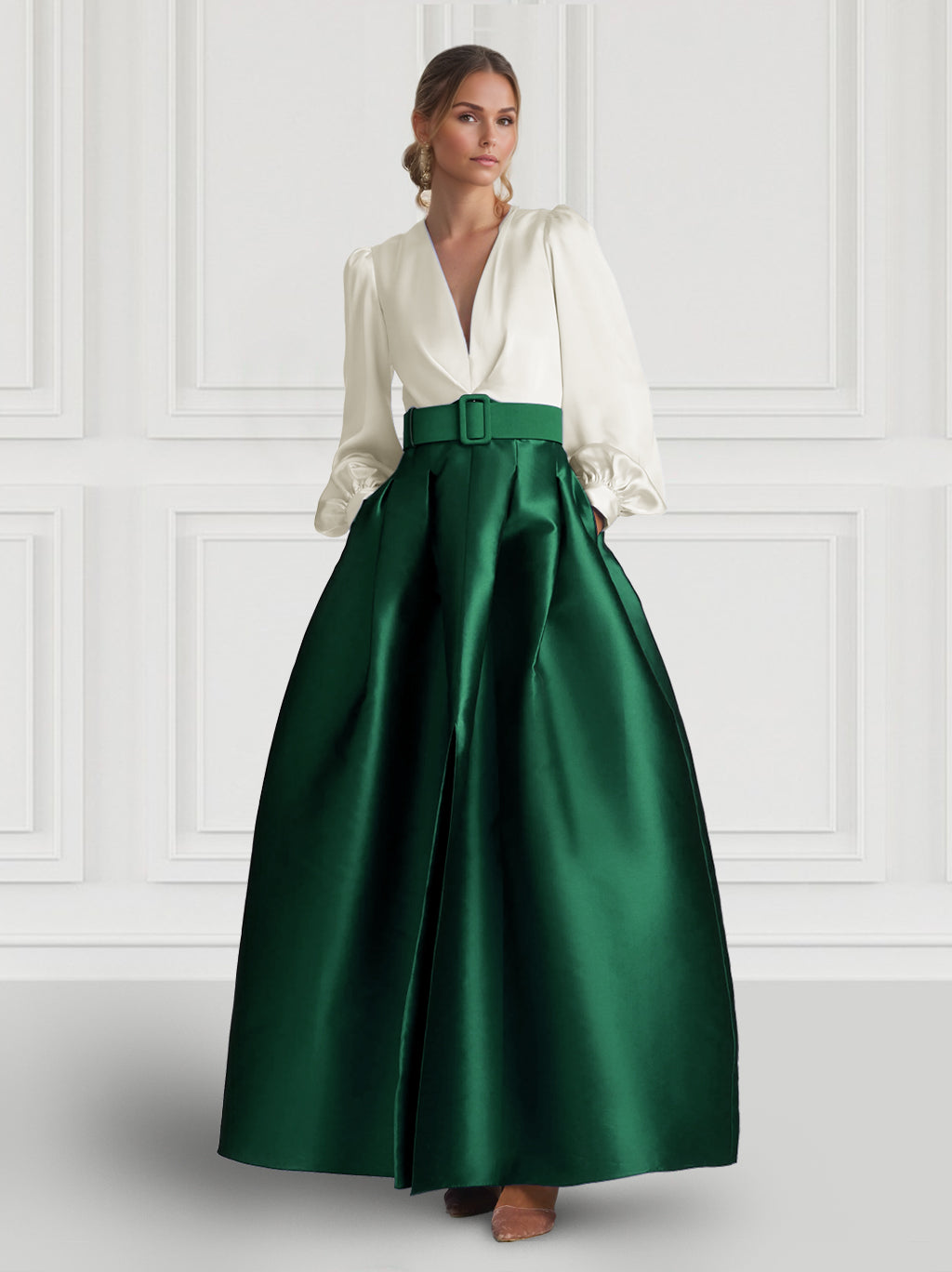 Fabric: Satin Silhouette: A-Line Neckline: V Neck Hemline/Train : Floor Length Establishment: Belt Sleeve: Long Sleeves Shown Color: Green
