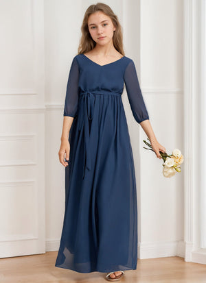 A-Line/Princess V-Neck 3/4 Sleeves Junior Girl Bridesmaid Dresses with Sash