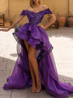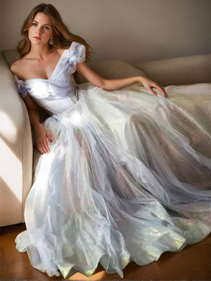Off-the-Shoulder Evening Asymmetrical Long Prom Ball Gown With Sequins