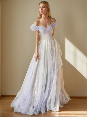 A-Line/Princess Off-the-Shoulder Long Prom Evening Party Dresses with Split Side & Ruffles