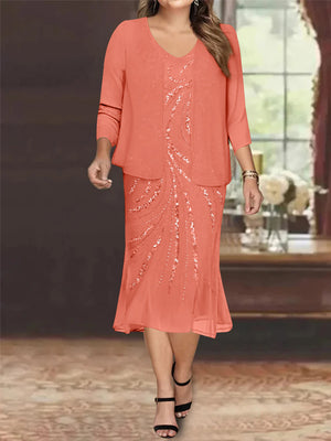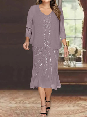 Chiffon 2 Pieces V-Neck Knee-Length Plus Size Mother of the Bride Dresses with Jacket & Sequins