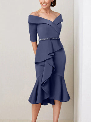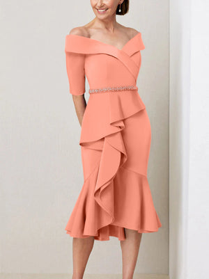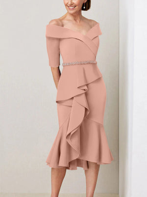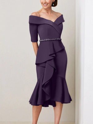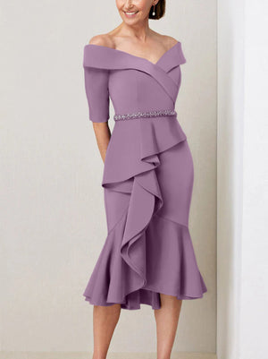 Sheath/Column Off-the-Shoulder Half Sleeves Mother of the Bride Dresses with Beading & Ruffles