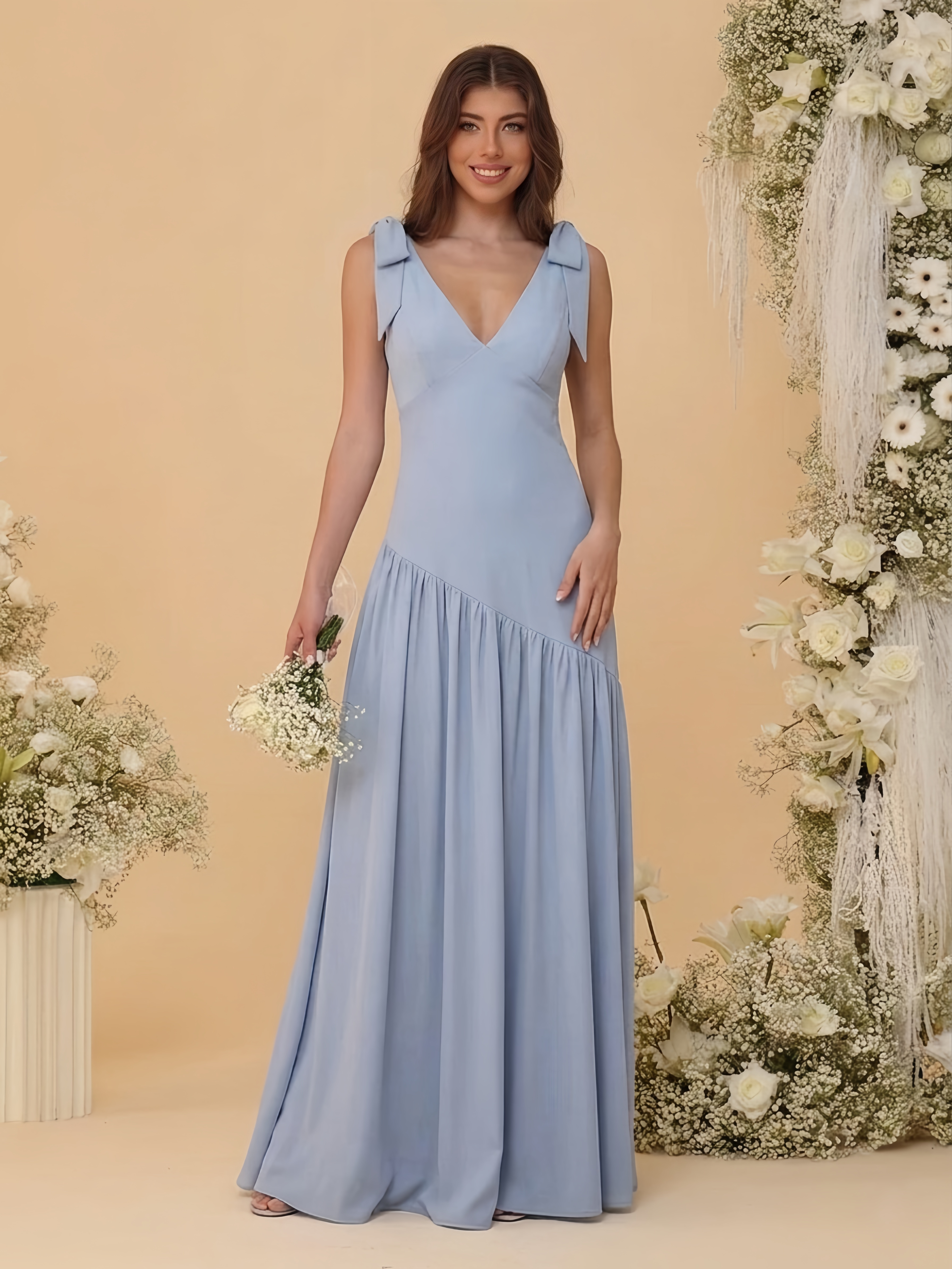 #N468203 A-Line/Princess Chiffon Bridesmaid Dresses For Wedding V Neck Sleeveless Floor-Length With Bow
