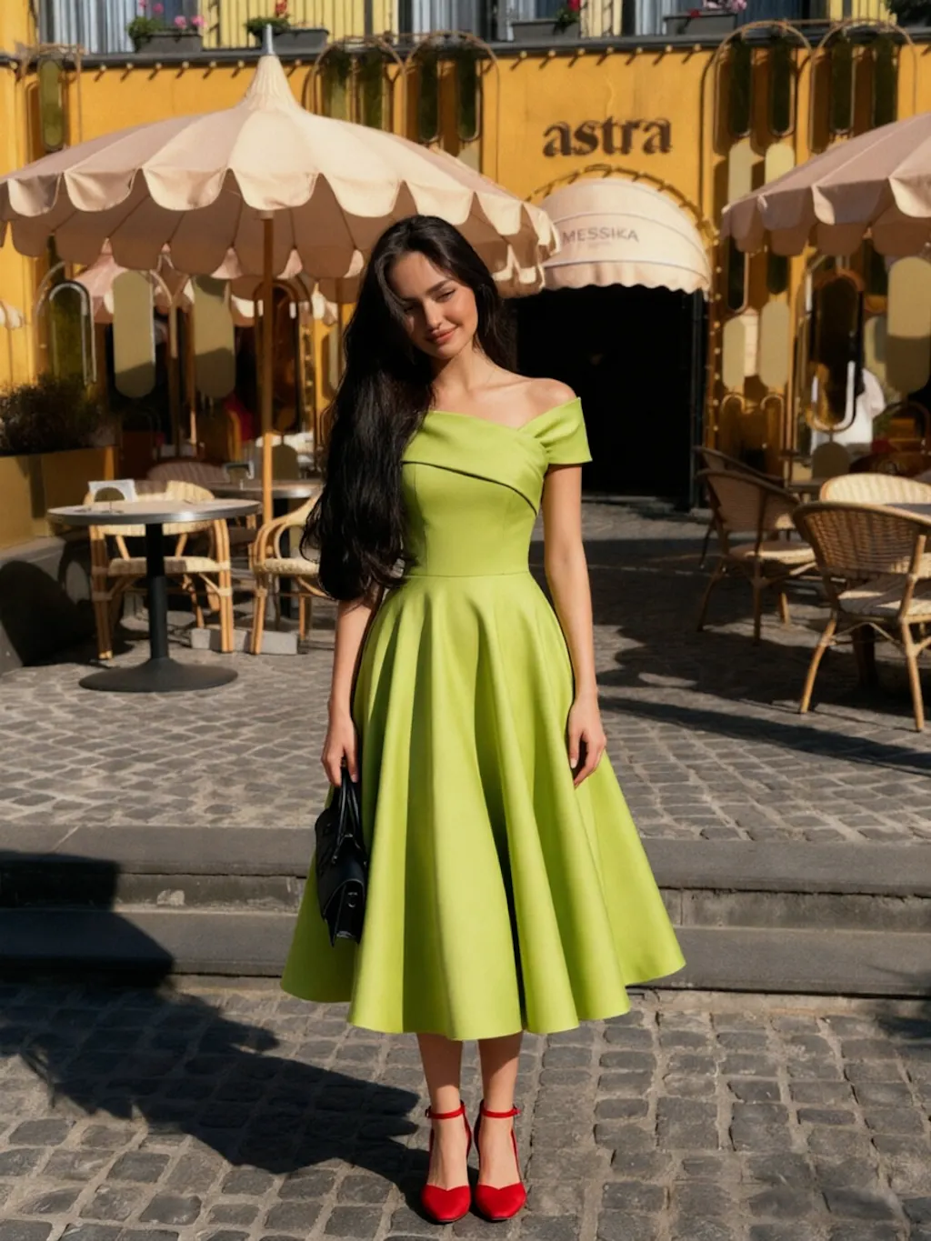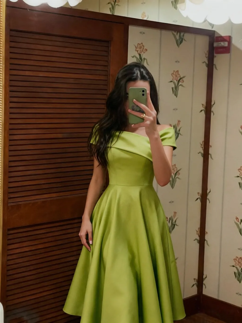 #N365103 A-Line/Princess Elegant Cocktail Dress Corset Off-The-Shoulder Short Sleeves Tea-Length Satin Dress