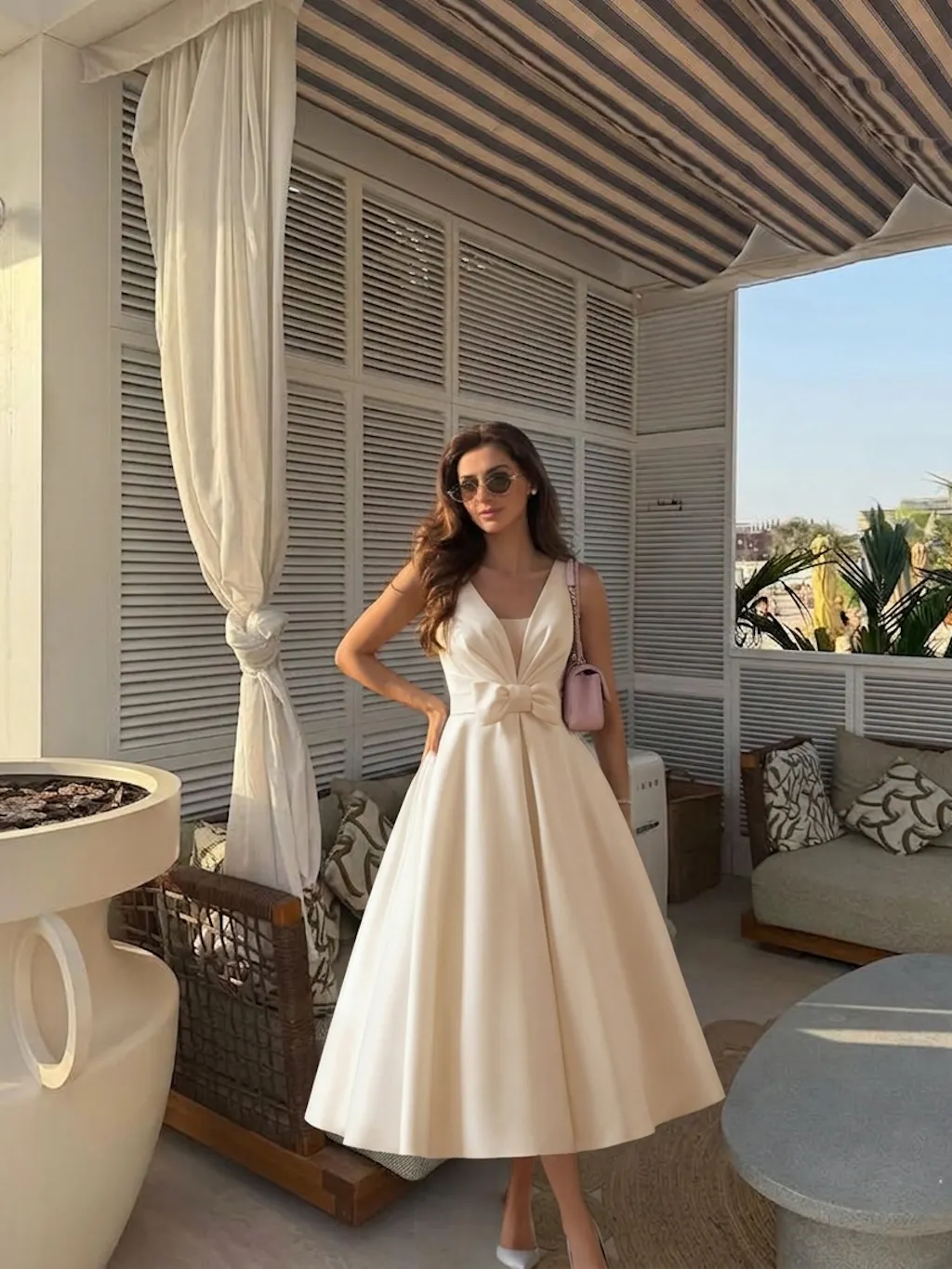 #N365403 A-Line/Princess Wedding Dresses Little White Dress V-Neck Sleeveless Corset Ankle-Length Wedding Dress With Bow
