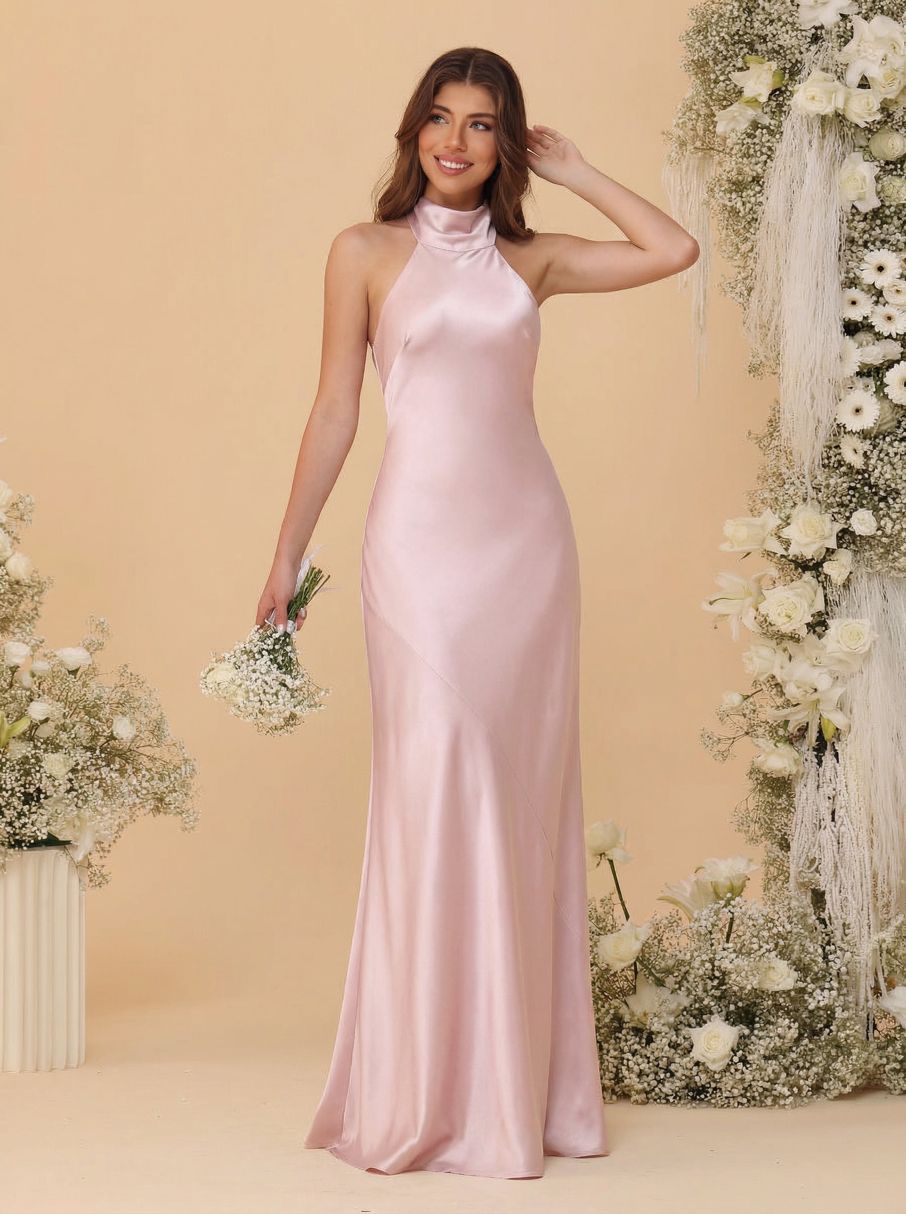 • Sheath/Column Bridemaid Dresses Satin Backless Sleeveless Floor-Length Dresses With Bow