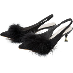 Women's Wedding Shoes Black Pointed Toe Low Heel Buckle Bridal Shoes with Feather