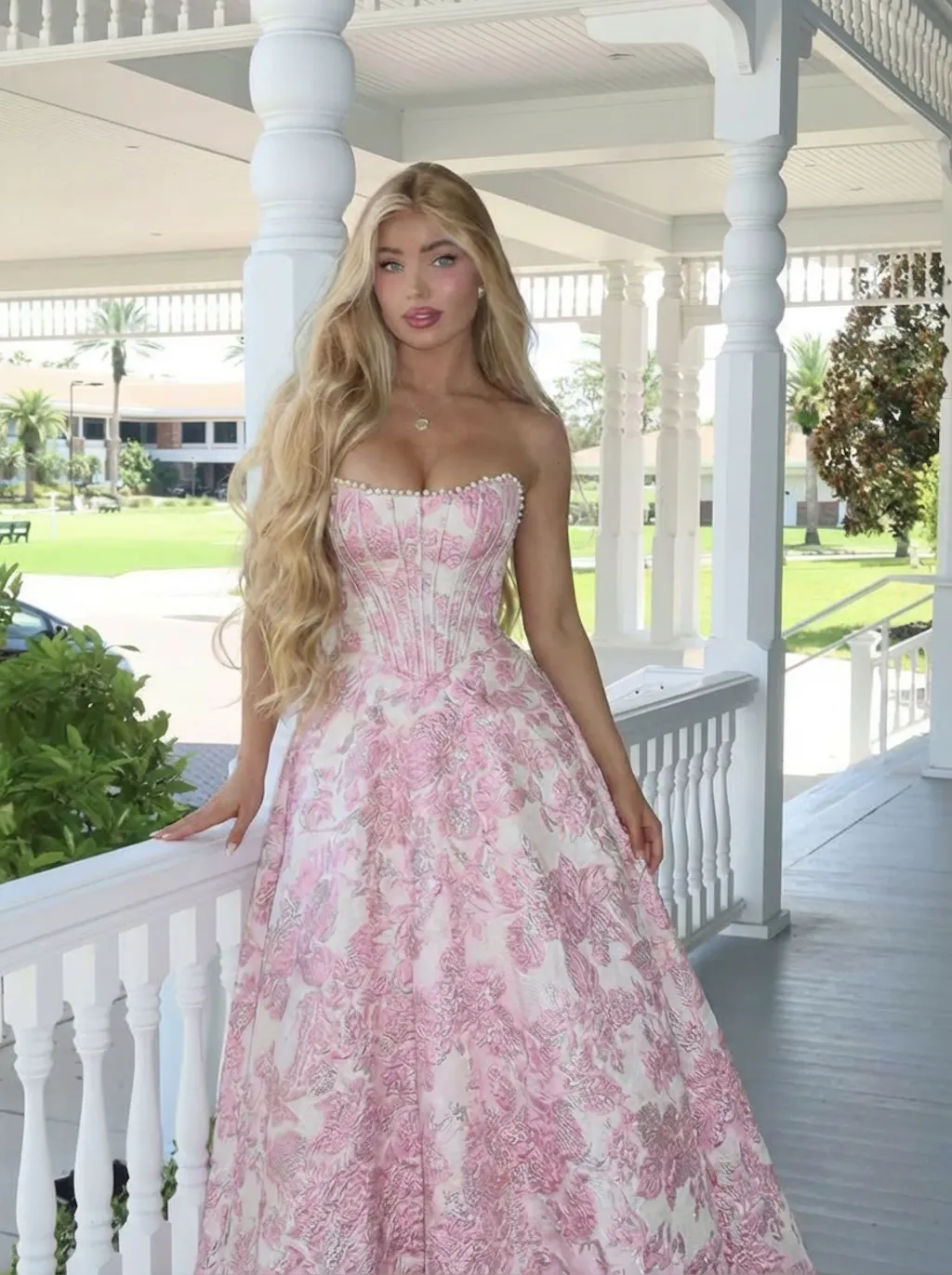 #N461502 A Line Strapless Floral Long Prom Dress Basque Waist Corset Jacquard Dress With Pearls Ball Gowns