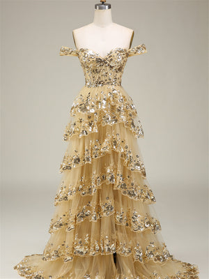 A-Line/Princess Sweetheart Off-the-Shoulder Long Prom Evening Party Floral Dresses with Sequins & Ruffles