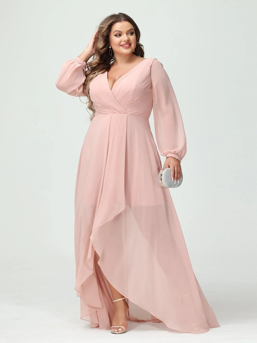 #N5411888 A-Line/Princess V-Neck Long Sleeves Asymmetrical Plus Size Bridesmaid Dresses with Pockets