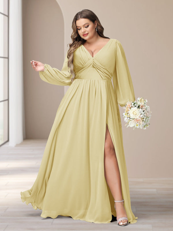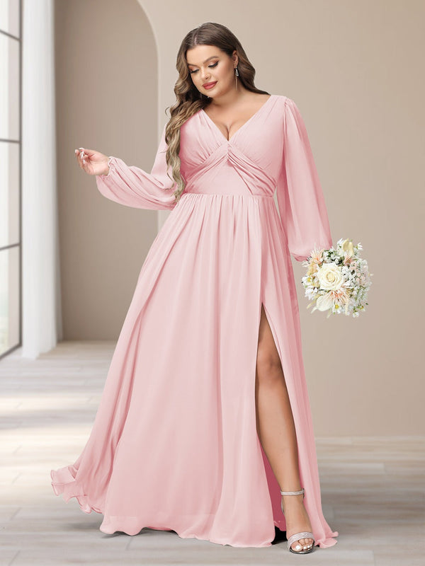 #N5411945 A-Line/Princess V-Neck Long Sleeves Chiffon Long Plus Size Bridesmaid Dresses With Split Side