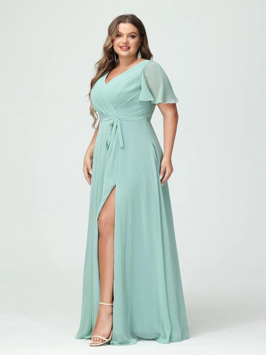 #N5411886 A-Line/Princess V-Neck Short Sleeves Plus Size Bridesmaid Dresses with Pockets Belt & Split Side