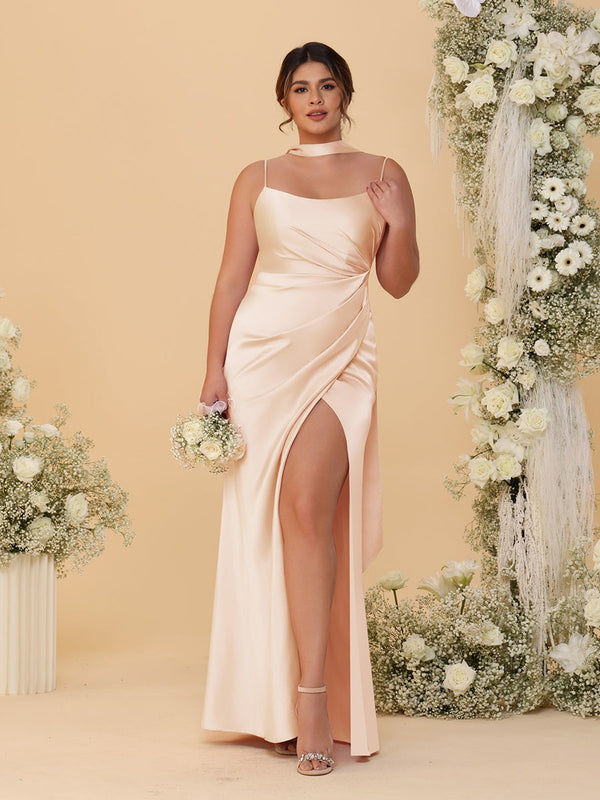 #N99122109P Sheath/Column Silk Satin Spaghetti Straps Sleeveless Floor-Length Ruched Bridesmaid Dresses With Neck Scarf & Split Side
