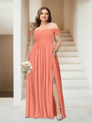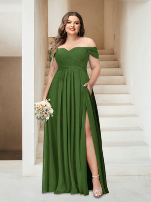 A-Line/Princess Off-the-Shoulder Plus Size Bridesmaid Dresses With Side Slit & Pleats