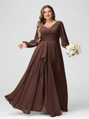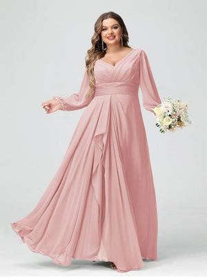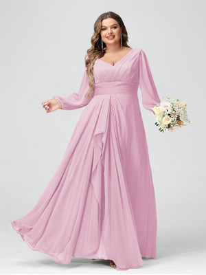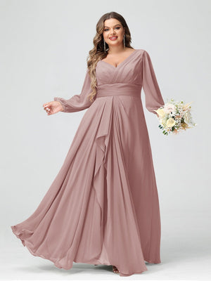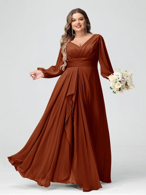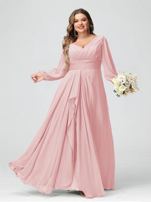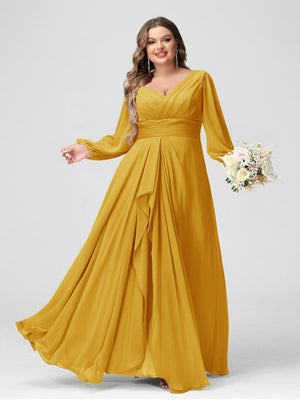 A-Line/Princess V-Neck Long Sleeeves Chiffon Ruffles Plus Size Bridesmaid Dresses with Pockets
