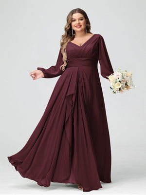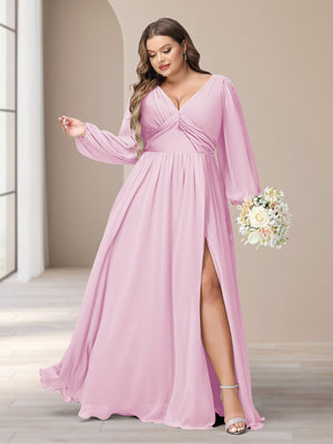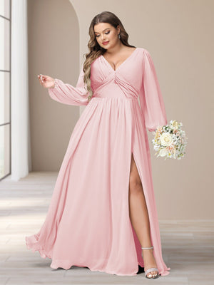 A-Line/Princess V-Neck Long Sleeves Chiffon Long Plus Size Bridesmaid Dresses With Split Side