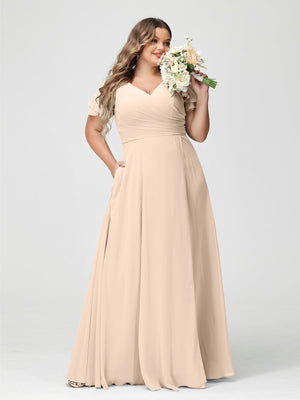 A-Line/Princess/Princess V-Neck Short Sleeves Chiffon Plus Size Bridesmaid Dresses with Pockets & Split Side