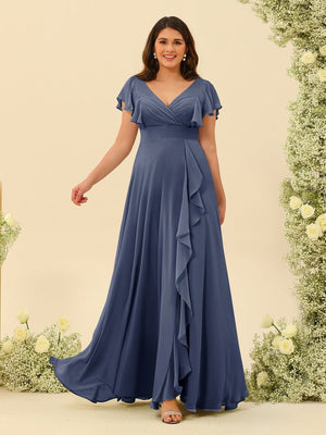 A-Line/Princess V-Neck Half Sleeves Chiffon Plus Size Bridesmaid Dresses with Split Side & Ruffles