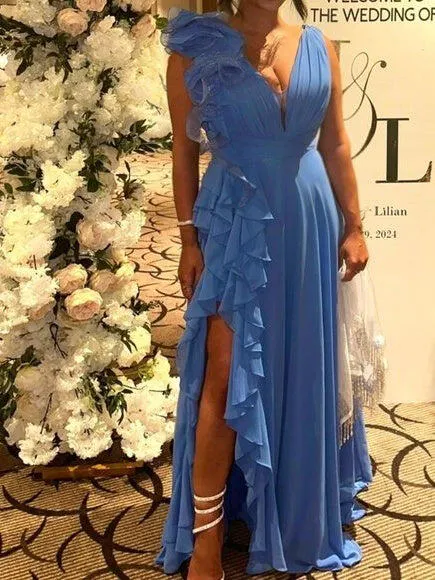 #N342134 A-Line Court Train Sleeveless V Neck Chiffon Prom Dress with Ruffles Shoulder Flower
