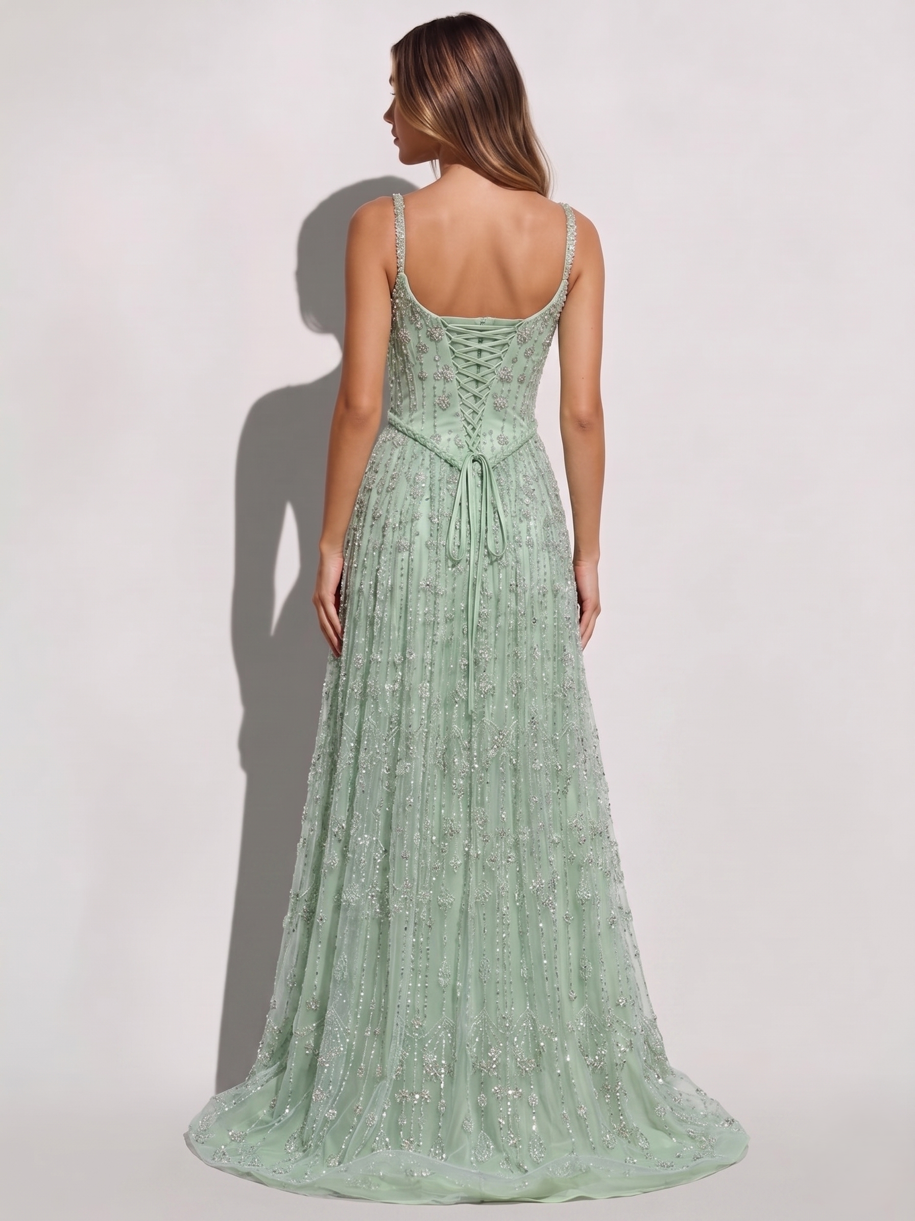 #N263904 A-Line/Princess Prom Dresses Luxury Spaghetti Straps Sleeveless Sage Floor-Length Dress
