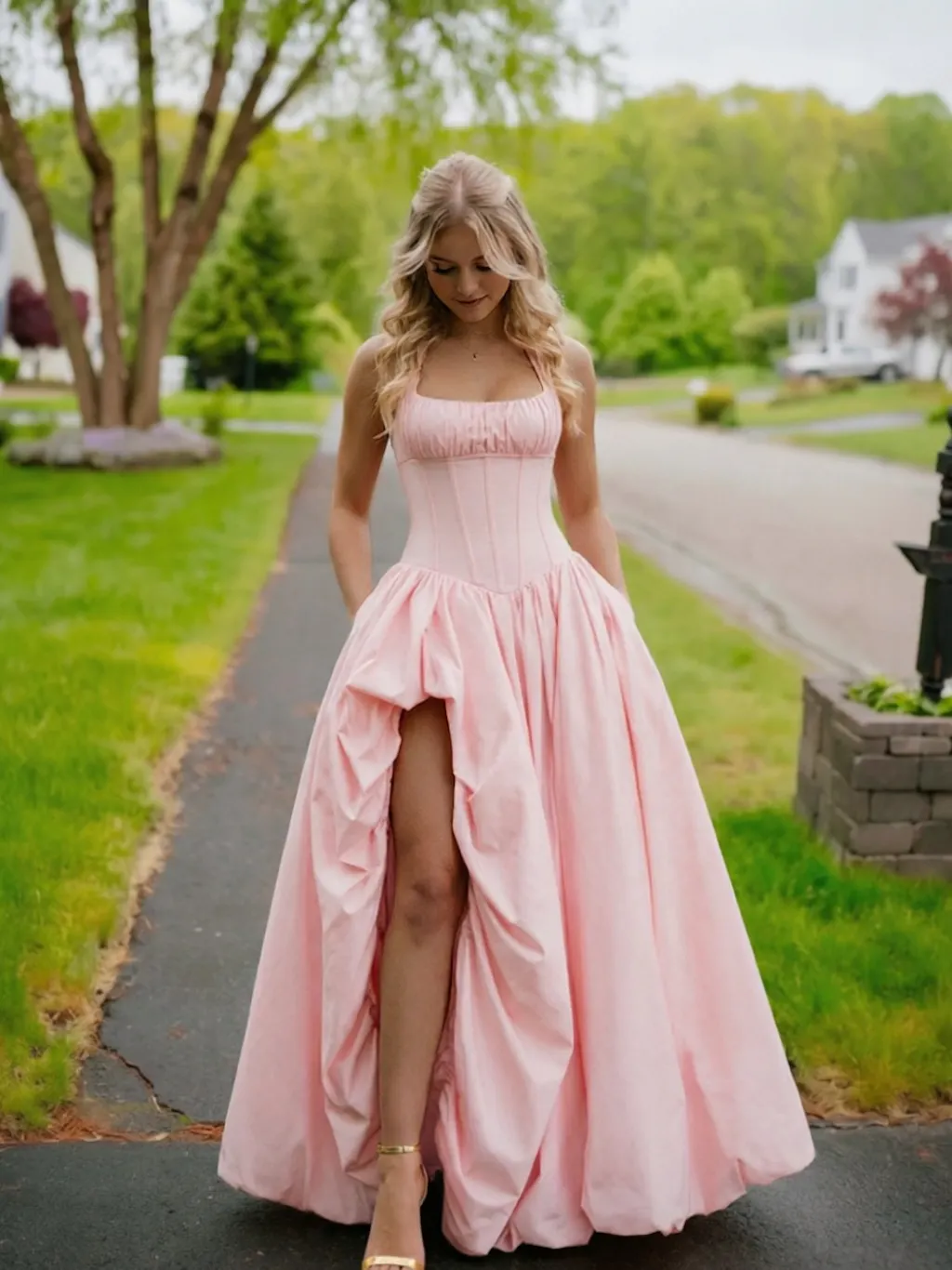 #N462103 A-Line/Princess Long Pink Prom Dresses Basque Waist Stretch Halter Neck Floor-Length Side Split With Pleats&Back Lace-Up Wedding Guest Dresses