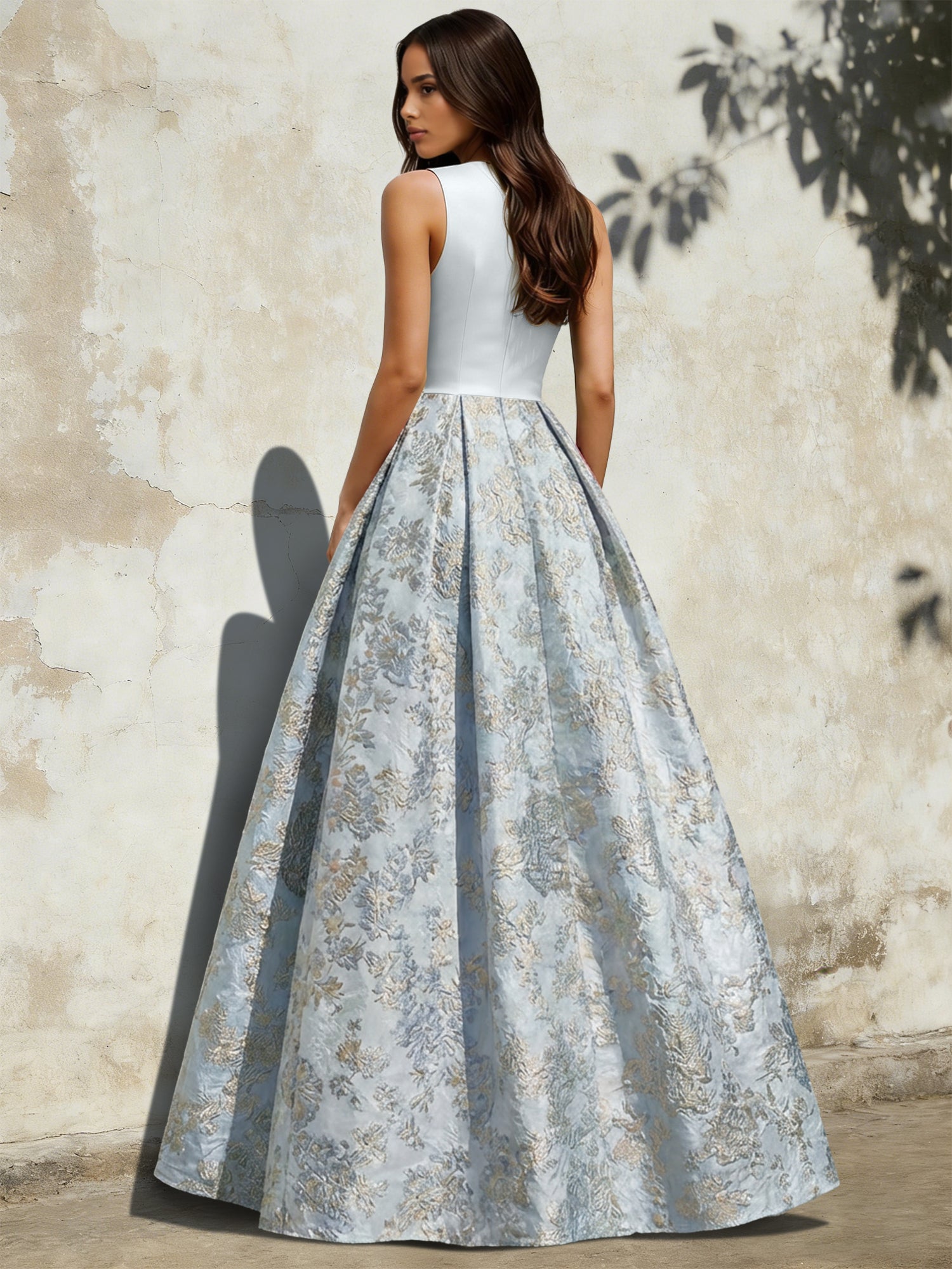 • A-Line Evening Gown Elegant Jacquard Floral Dress Floor Length Sleeveless V Neck with Slit Pocket Dusty Blue Wedding Guest Dress