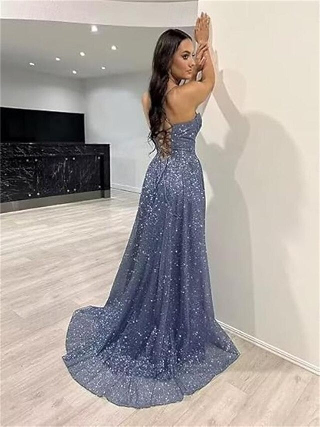 • A-Line Gold Prom Dresses Glittering Dress Formal Evening Party Sweep / Brush Train Sleeveless Spaghetti Straps Tulle with Glitter Slit
