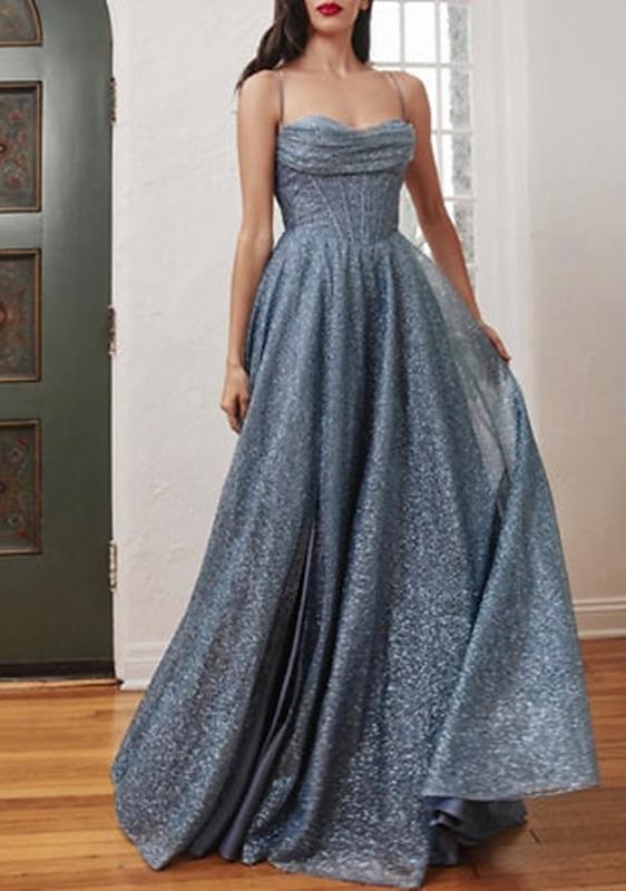 #N350809 A-Line Gold Prom Dresses Glittering Dress Formal Evening Party Sweep / Brush Train Sleeveless Spaghetti Straps Tulle with Glitter Slit