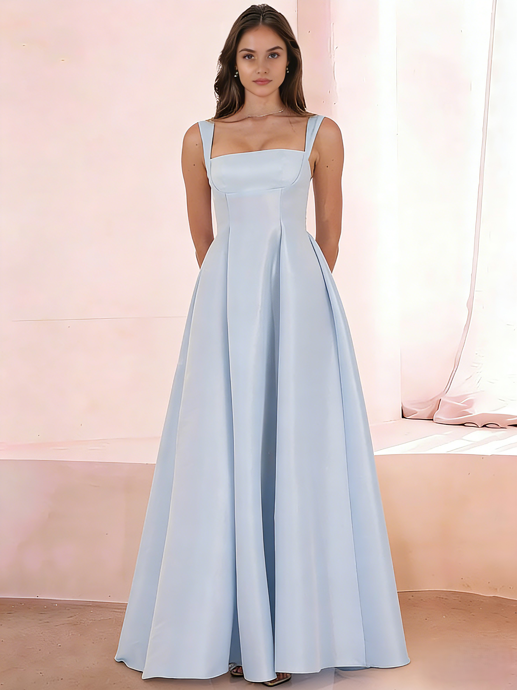 • A-Line/Princess Square Neck Sleeveless Floor-Length Elegant Satin Prom Dresses