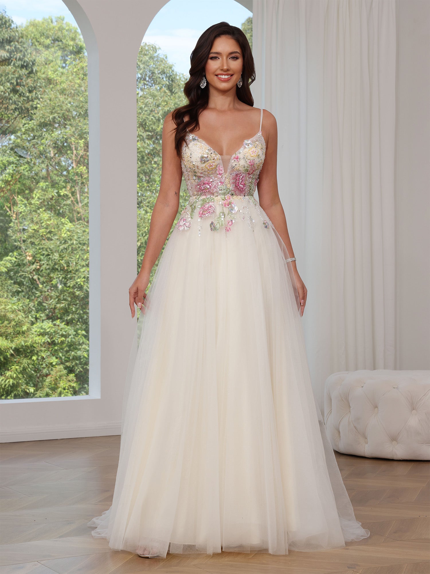• A-Line/Princess Tulle Prom Dress Formal Long Dresses Sleeveless Floor-length With Floral Appliques