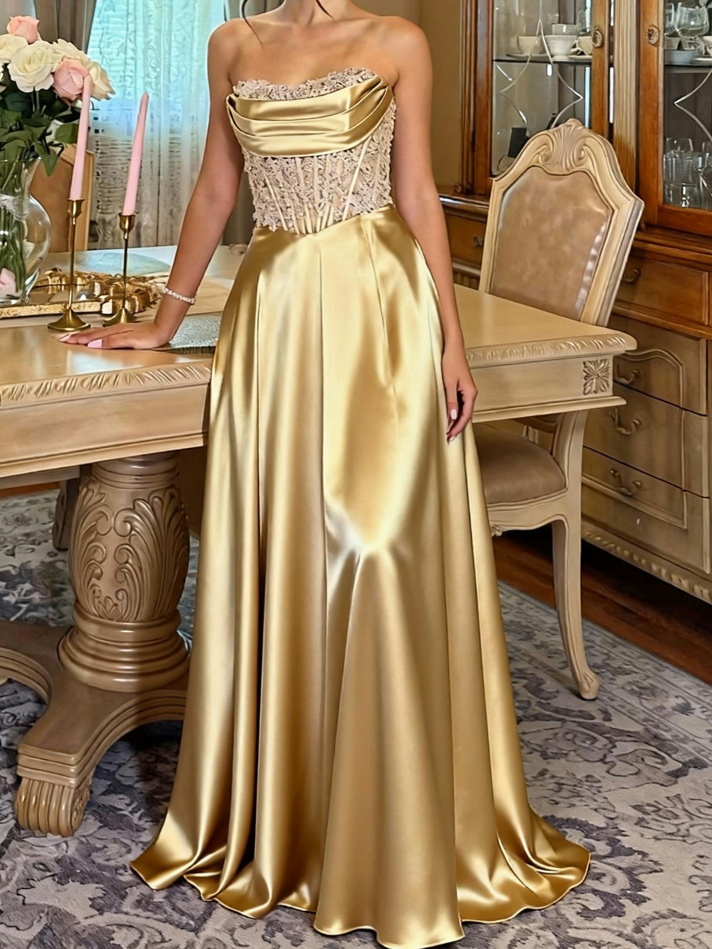 #N250312 A Line/Princesses Prom Dresses Satin Strapless Floor-Length Formal Corset Dress With Lace Appliques