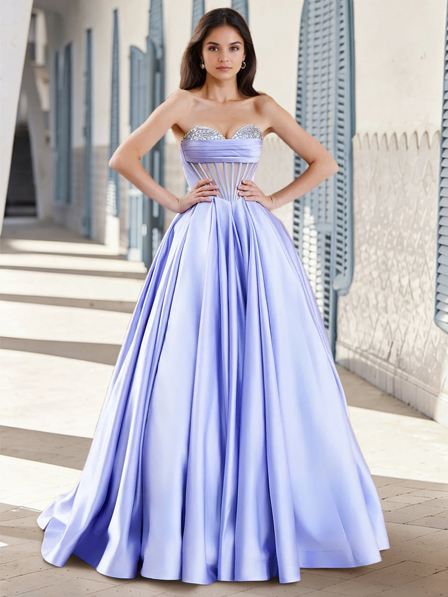 • Ball Gown Long Prom Dresses Satin Formal Dresses Corset Sweetheart Sleeveless Floor-length With Rhinestone Cups