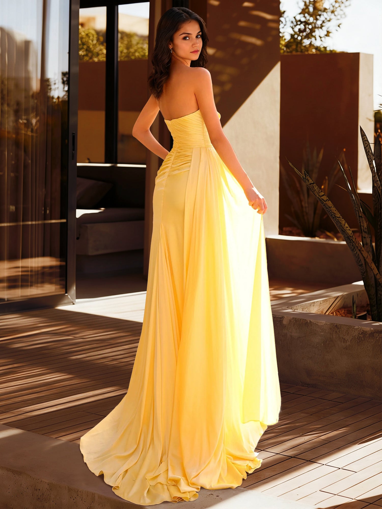 • Sheath/Column Long Prom Dresses Strapless Sleeveless Floor-length Satin Evening Dresses With Side Split