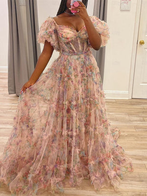 A-Line/Princess Off-the-Shoulder Printed Floral High-End Prom Dresses with Ruffles