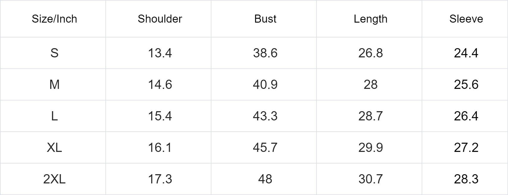 | Size/Inch | Shoulder | Bust | Length | Sleeve |