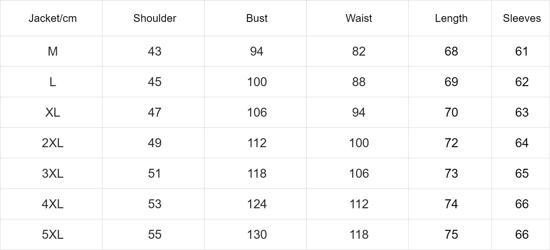 | Jacket/cm | Shoulder | Bust | Waist | Length | Sleeve |