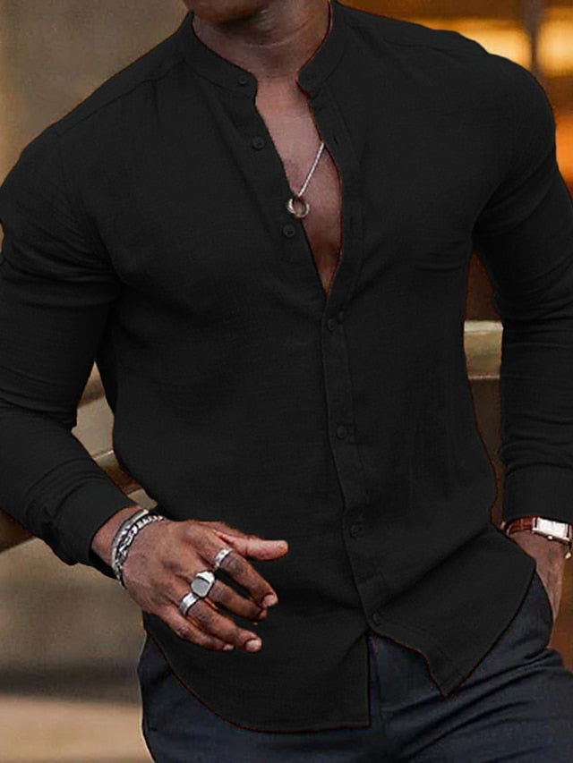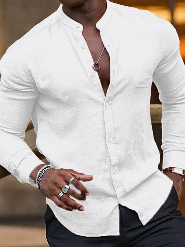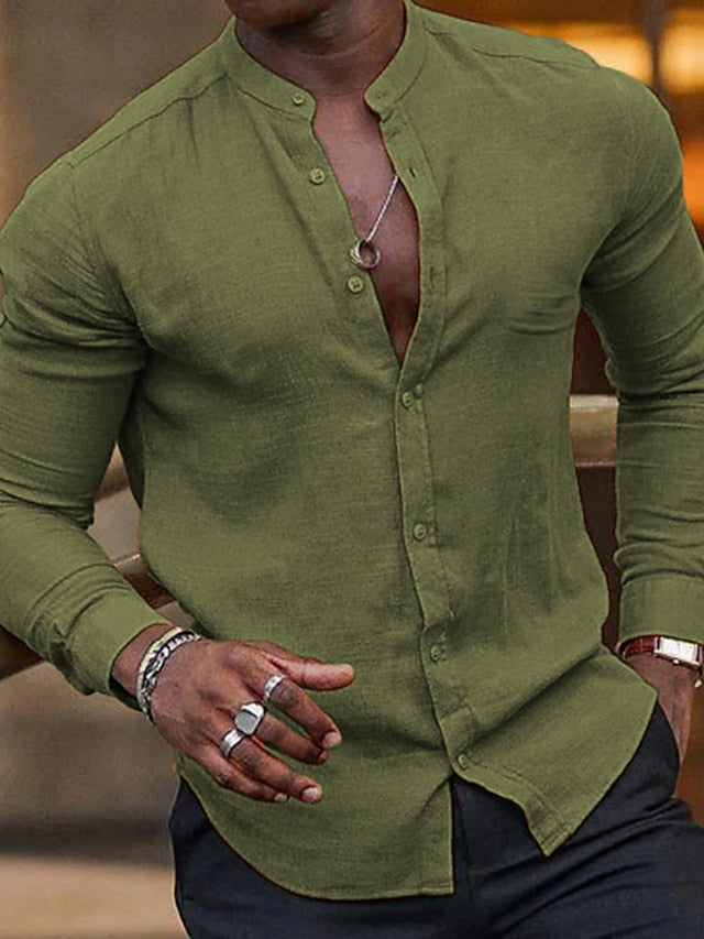 • Men's Casual Cotton Linen Long Sleeves Solid Color Shirt