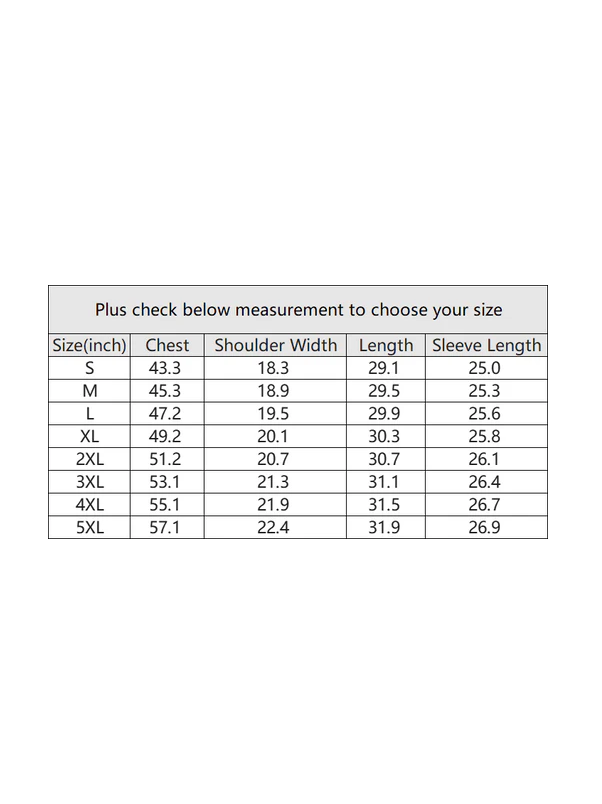 | Size(inch) | Chest | Shoulder Width | Jacket length | Sleeves length |